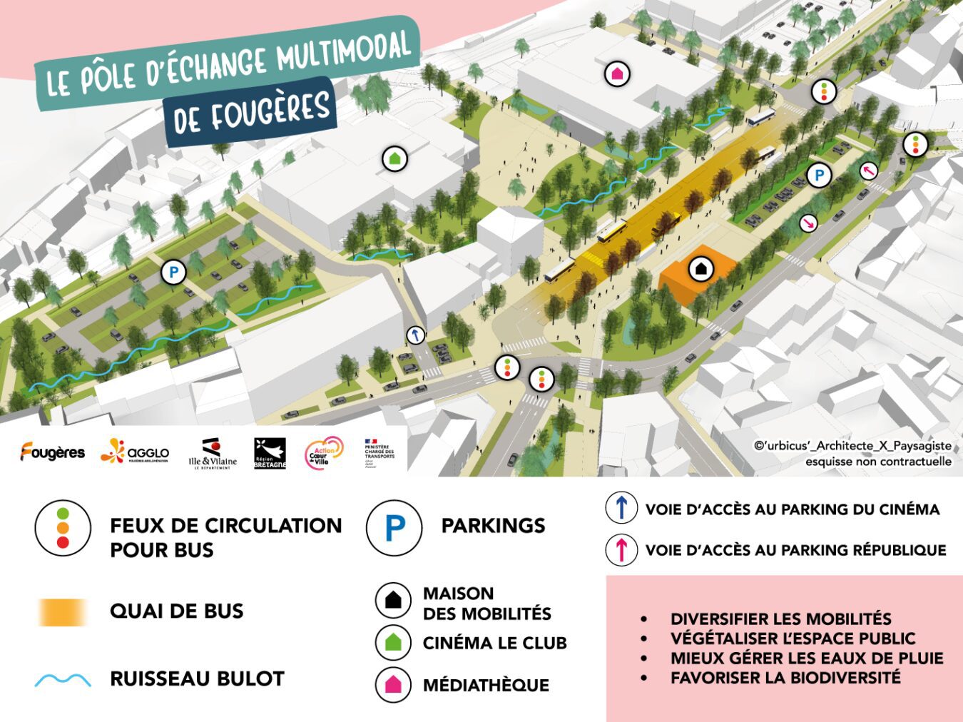 Côté place de la République et esplanade des chaussonnières, il s’agit de concevoir un pôle de transports pour les lignes régionales Breizh Go et celles du SURF de Fougères Agglomération, le long de la médiathèque, et de créer une place partagée avec tous les usagers : piétons, cyclistes et automobilistes.